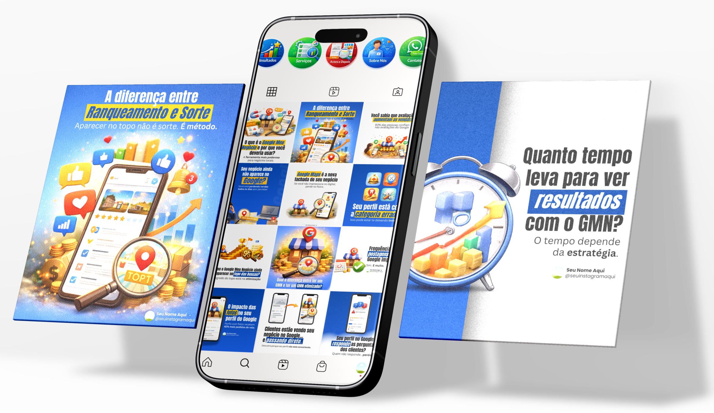 Receba 8 Capas para Destaques: Resultados, FAQ, Serviços, Depoimentos, Antes e Depois, Sobre Nós, Pacotes, Google na Prática e Contato. Tudo pensado para valorizar sua presença no Instagram.
